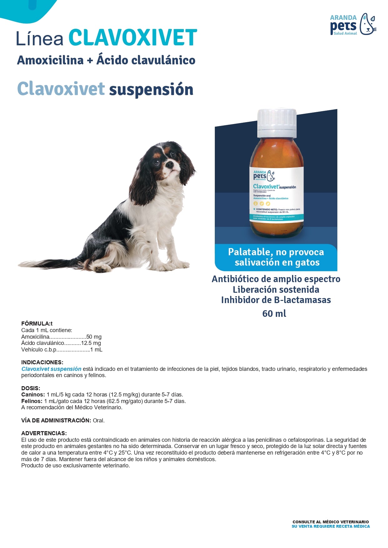 CLAVOXIVET® es un antibiótico de amplio espectro de la familia de las penicilinas, potenciado con ácido clavulánico, un inhibidor de β-lactamasas que protege la amoxicilina de la degradación bacteriana. Está especialmente formulado para el tratamiento de infecciones bacterianas sensibles en animales domésticos. Su presentación en suspensión palatable facilita la administración, incluso en gatos, sin provocar salivación excesiva.