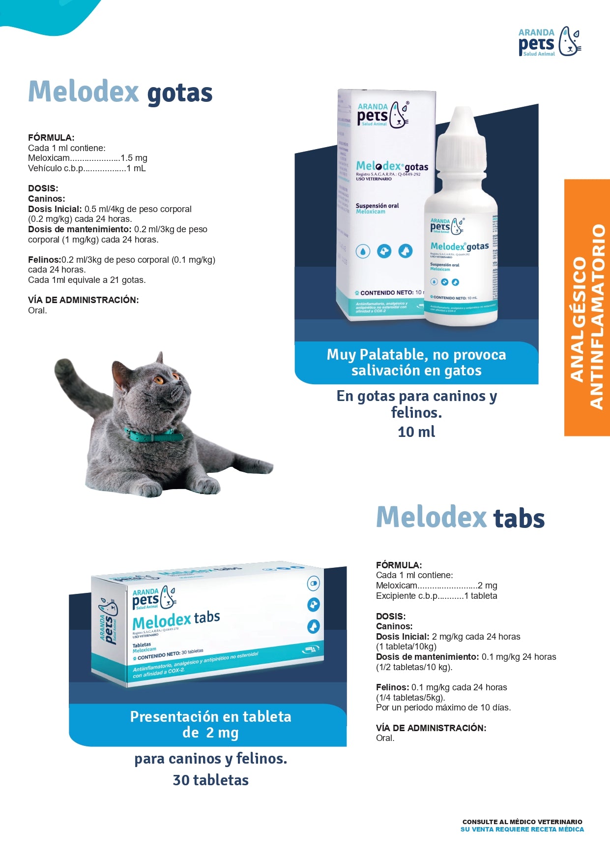 Está indicado para el tratamiento del dolor e inflamación aguda o crónica de origen músculo-esquelético, artritis, esguinces, traumatismos, dolor postoperatorio y procesos inflamatorios asociados en caninos y felinos.
