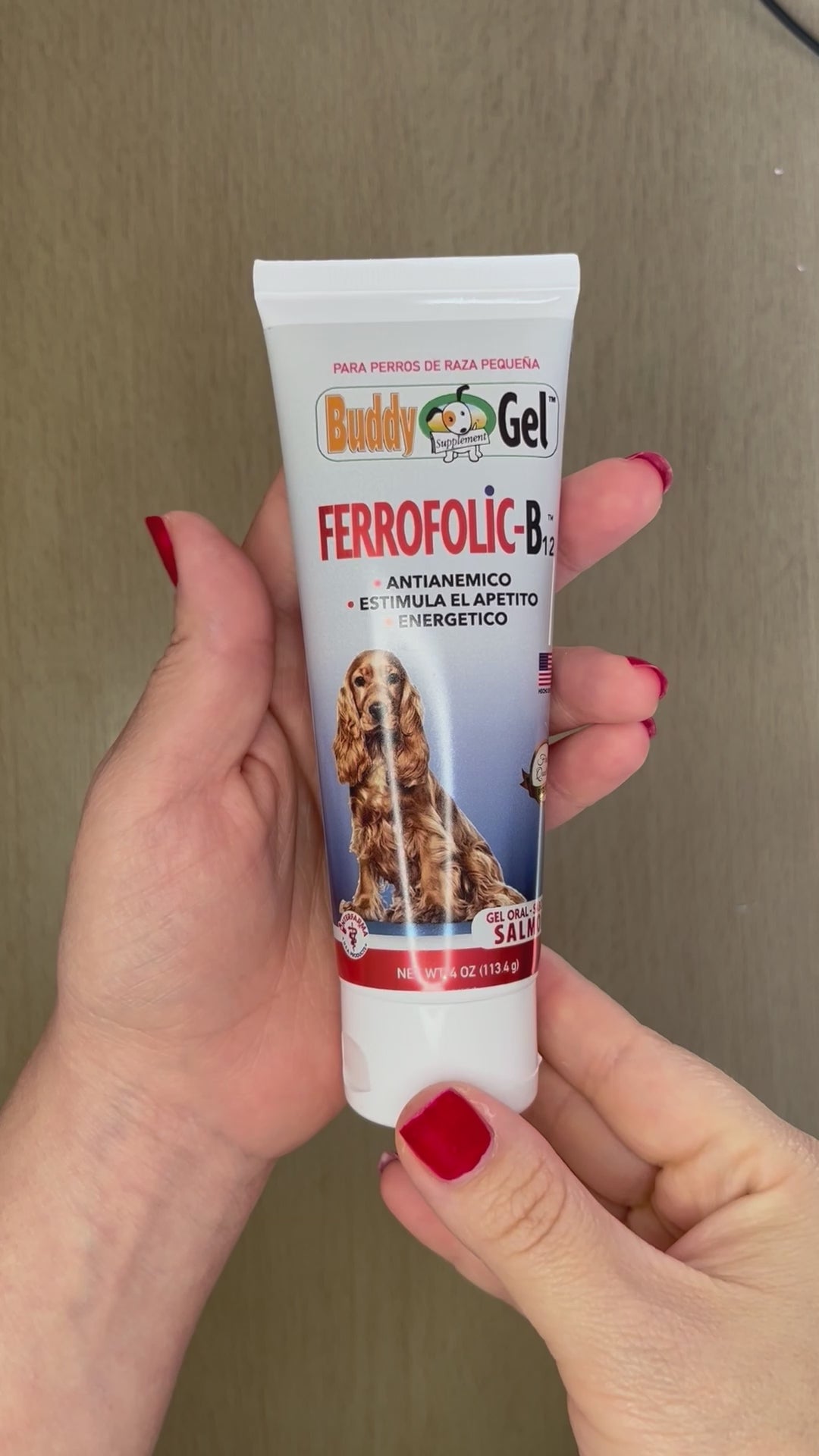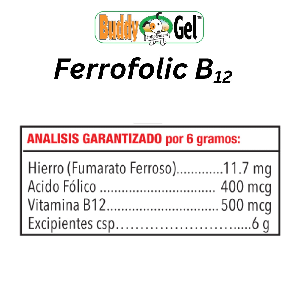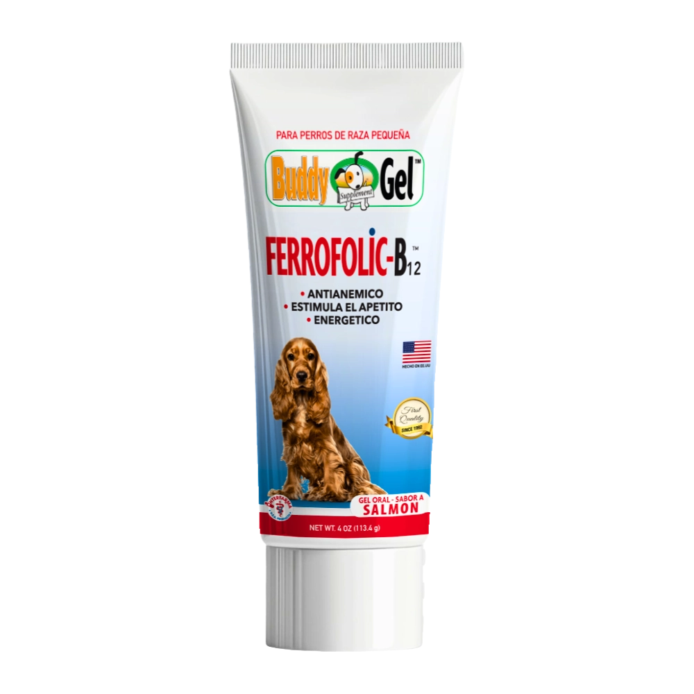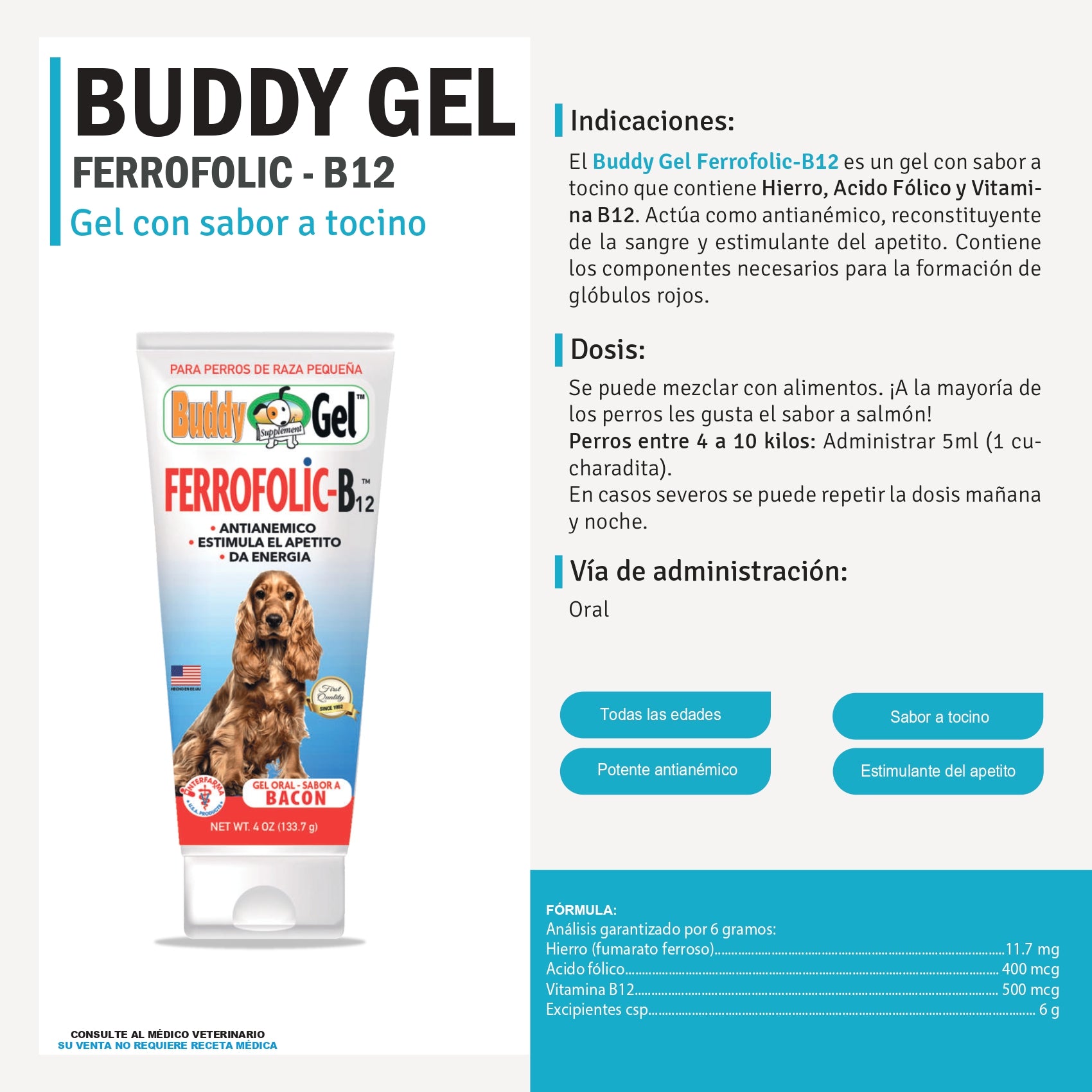 El Buddy Gel Ferrofolic-B12 es un gel con sabor a tocino que contiene hierro, ácido fólico y vitamina B12. Actúa como antianémico, reconstituyente de la sangre y estimulante del apetito. Contiene los componentes necesarios para la formación de glóbulos rojos y la regeneración sanguínea. Recomendado en casos de anemia nutricional, convalecencia, debilidad o crecimiento acelerado.