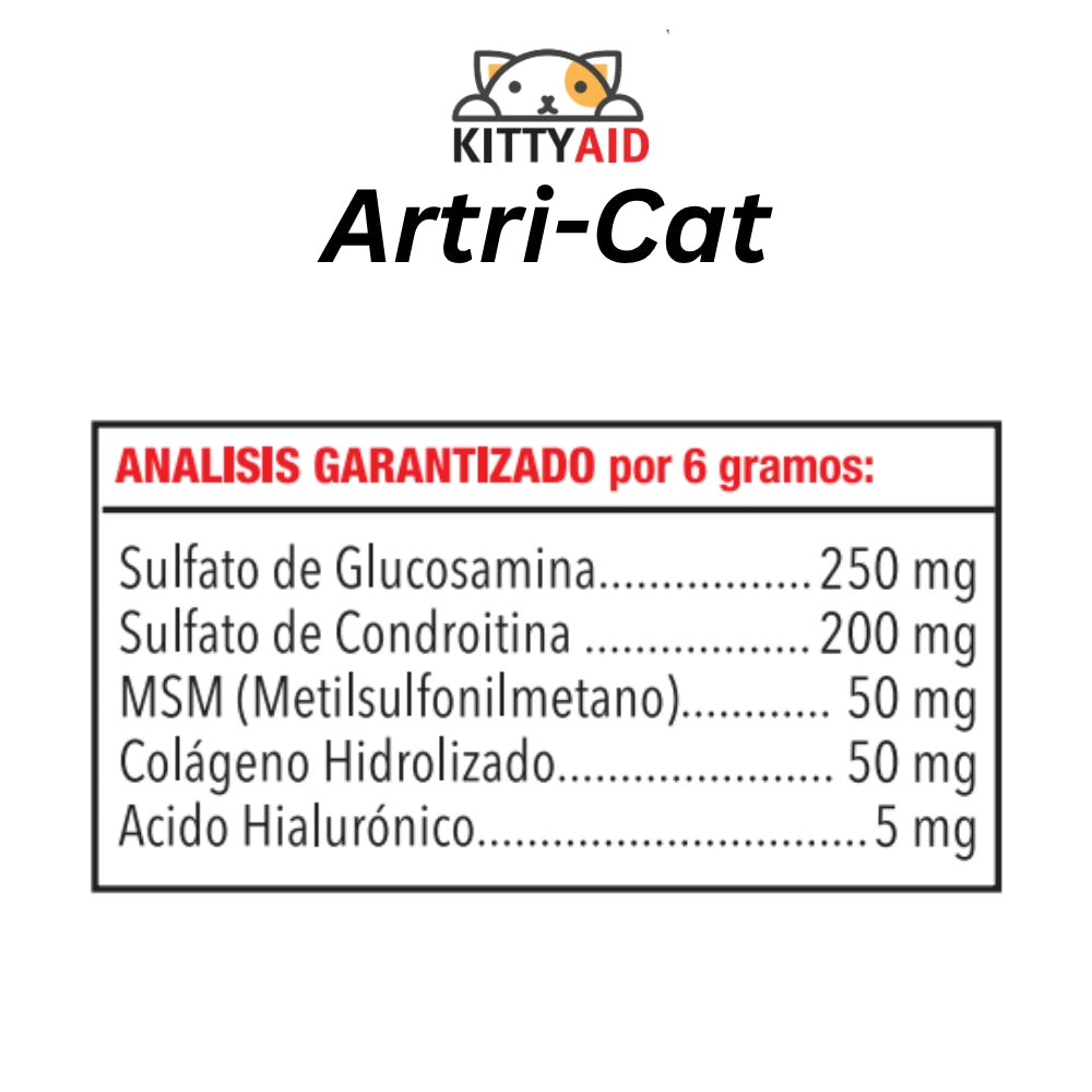 Suplemento nutricional coadyuvante en el tratamiento de enfermedades articulares degenerativas como osteoartritis, tendinitis y artrosis en gatos. Favorece la regeneración del cartílago articular, mejora la movilidad y reduce la inflamación y el dolor. Su fórmula avanzada combina glucosamina, condroitina, MSM, colágeno hidrolizado y ácido hialurónico, ingredientes reconocidos por su acción protectora y regenerativa sobre las articulaciones.